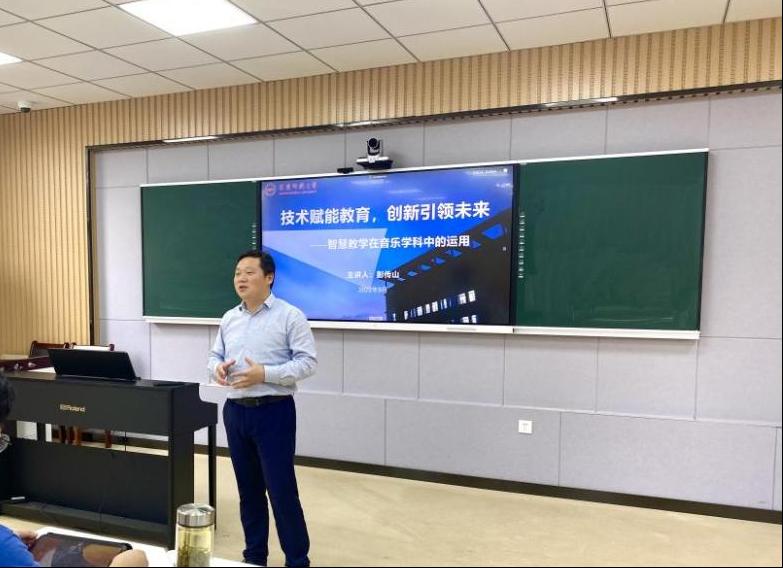 为进一步加快推进信息技术与公司产品融合创新,助力教师熟练应用智慧教学手段和方法,提高教学能力和教学效果,推进“互联网+教学”改革进程,9月28日下午,谈球吧在智慧教室举办“智慧教学在音乐学科中的运用”的教学专题讲座,由谈球吧副经理彭传山主讲、副经理徐冉主持,教务处副处长阮建玲参与指导,公司全体教职工及部分研究生到场聆听。