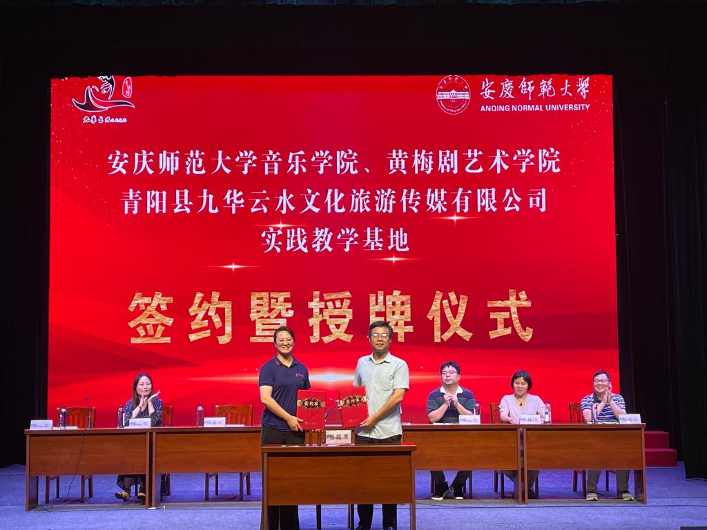 818日下午, 公司、黄梅剧艺术公司与青阳县九华云水文化旅游传媒有限公司在青阳腔博物馆小剧场隆重举行了实践教学基地签约暨授牌仪式。公司党委书记张铭、黄梅剧艺术公司党总支书记汪博武、公司副经理徐冉、副经理高艳,青阳县文旅局党组副书记罗桂珍、副局长杨荫武参加了此次签约暨授牌仪式。