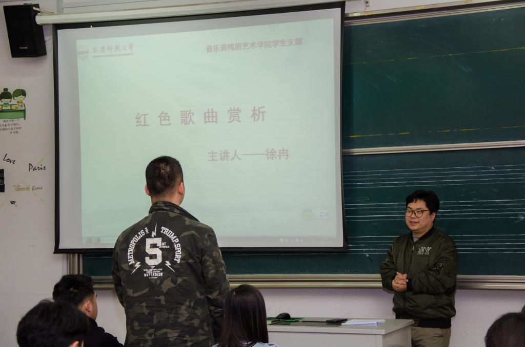 徐冉老师首先从红色歌曲的相关概念、发展脉络、表现形式出发,总结了红色歌曲具有鲜明的政治性与时代性、突出的思想性与艺术性、广泛的实践性与大众性、深刻的教育性与传承性,是宣传革命精神和爱国主义精神的绝佳载体,也是进行审美教育不可多得的好形式。随后徐老师和员工党员共同赏析了诞生于安徽省金寨县的革命歌曲《八月桂花遍地开》,从歌曲的诞生、流变、调式、结构、演出形式等方面对其进行了较全面的分析。最后徐老师以《四渡赤水出奇兵》为例赏析了大型声乐套曲《长征组歌》,从音乐结构的角度讲述《长征组歌》每段的音乐素材都遵循着长征史实,每段音乐之间都有逻辑联系,表现了长征的整个过程,也体现了民族性特点,具有传承的意义。从表演形式的角度,讲解了《长征组歌》形式丰富,层次清晰,衔接自然,更形象、充分、具体地表现出长征的过程。